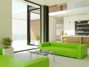 Light interior design with white walls and green couch
